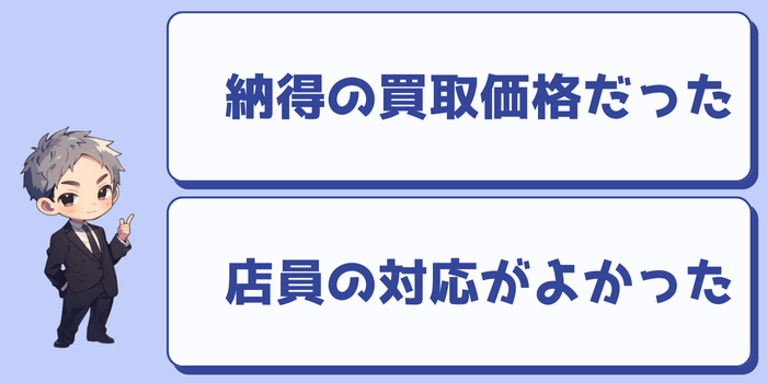 | 納得のいく買取価格だった 店員の対応がよかった | 買取価格が安すぎた 査定をしているのかあやしい 長時間待たされた 接客態度が悪かった 大切なコレクションを破損された |